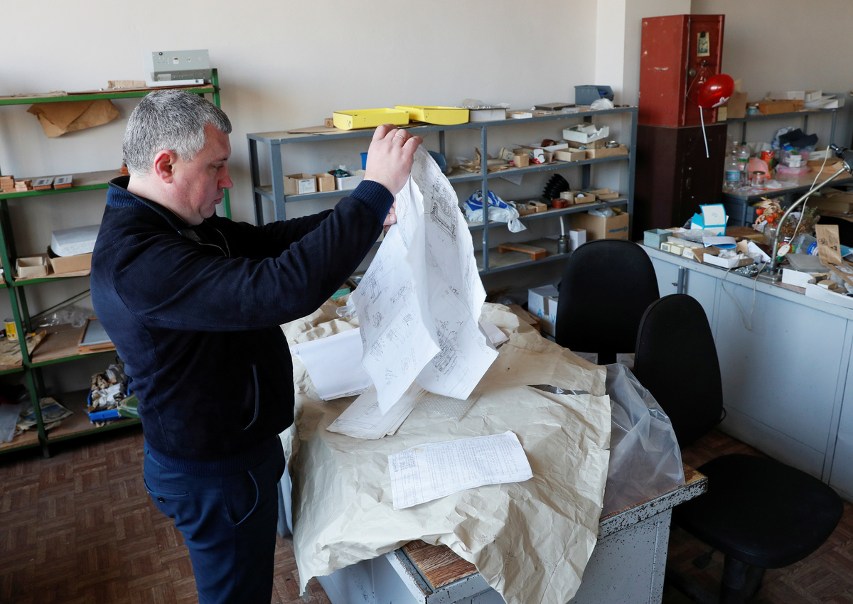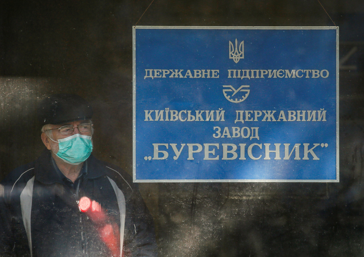 A watchman wearing a protective mask stands at an entrance of the disused Burevisnyk state-run military plant, which is considered by local authorities as the domestic producer of ventilators amid the outbreak of coronavirus disease (COVID-19), in Kiev, Ukraine March 26, 2020. The board reads: "State enterprise. Kiev state factory Burevisnyk". REUTERS/Gleb GaranichThe plant's Acting Director Vitaly Khodzitsky shows old photos with ventilators in hospitals at the disused Burevisnyk state-run military plant, which is considered by local authorities as the domestic producer of ventilators amid the outbreak of coronavirus disease (COVID-19), in Kiev, Ukraine Mach 26, 2020. REUTERS/Gleb GaranichDeputy Director General of Ukroboronprom Mustafa Nayyem shows an old ventilator together with instructions and designs, after the disused Burevisnyk state-run military plant was chosen by local authorities as the domestic producer of ventilators amid the outbreak of coronavirus disease (COVID-19), in his office in Kiev, Ukraine March 26, 2020. REUTERS/Gleb GaranichThe plant's Acting Director Vitaly Khodzitsky looks at old designs and instructions at the disused Burevisnyk state-run military plant, which is considered by local authorities as the domestic producer of ventilators amid the outbreak of coronavirus disease (COVID-19), in Kiev, Ukraine March 26, 2020. REUTERS/Gleb GaranichAn interior view shows the disused Burevisnyk state-run military plant, which is considered by local authorities as the domestic producer of ventilators amid the outbreak of coronavirus disease (COVID-19), in Kiev, Ukraine March 26, 2020. The banner reads: "To strengthen the union of science and production!" REUTERS/Gleb GaranichA view shows old equipment covered with dust at the disused Burevisnyk state-run military plant, which is considered by local authorities as the domestic producer of ventilators amid the outbreak of coronavirus disease (COVID-19), in Kiev, Ukraine March 26, 2020. REUTERS/Gleb GaranichDeputy Director General of Ukroboronprom Mustafa Nayyem walks inside the disused Burevisnyk state-run military plant, which is considered by local authorities as the domestic producer of ventilators amid the outbreak of coronavirus disease (COVID-19), in Kiev, Ukraine March 26, 2020. REUTERS/Gleb GaranichAn exterior view shows the disused Burevisnyk state-run military plant, which is considered by local authorities as the domestic producer of ventilators amid the outbreak of coronavirus disease (COVID-19), in Kiev, Ukraine Mach 26, 2020. REUTERS/Gleb GaranichDeputy Director General of Ukroboronprom Mustafa Nayyem shows the instructions and designs of an old ventilator, after the disused Burevisnyk state-run military plant was chosen by local authorities as the domestic producer of ventilators amid the outbreak of coronavirus disease (COVID-19), in his office in Kiev, Ukraine March 26, 2020. REUTERS/Gleb GaranichAn interior view shows the entrance of the disused Burevisnyk state-run military plant, which is considered by local authorities as the domestic producer of ventilators amid the outbreak of coronavirus disease (COVID-19), in Kiev, Ukraine March 26, 2020. REUTERS/Gleb Garanich