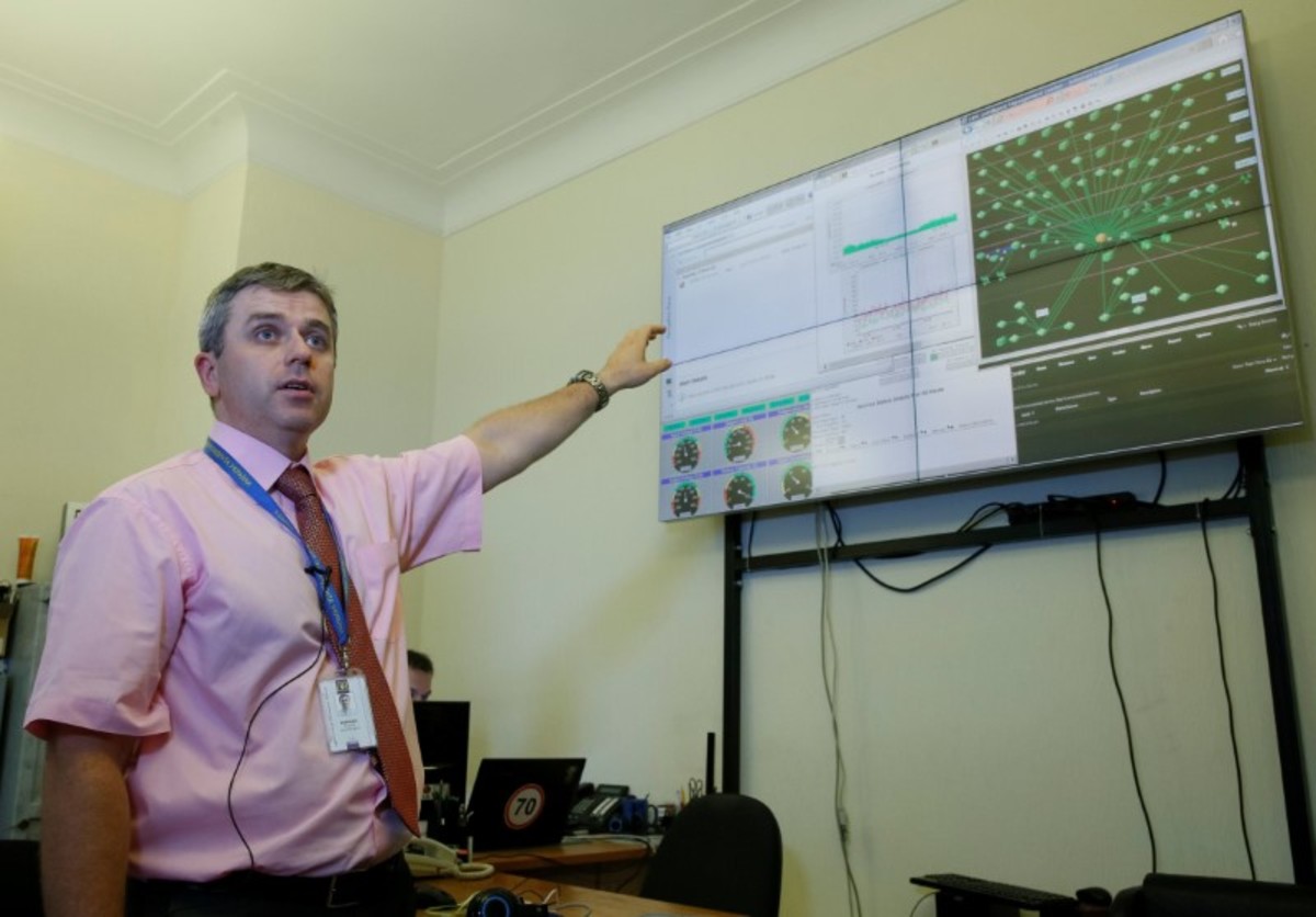 The team's small office has a screen with dials, charts and a green spider web showing activity on the network. If there is an attack, a voice shouts "major alarm!" in English, a recording the team downloaded from YouTube.