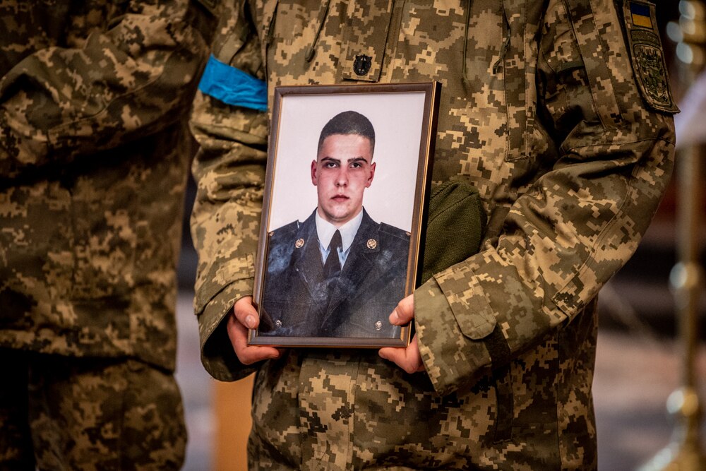Just one day after the Yavirov attack, young Ukrainian soldiers carry the body of Volodymyr into the church.
