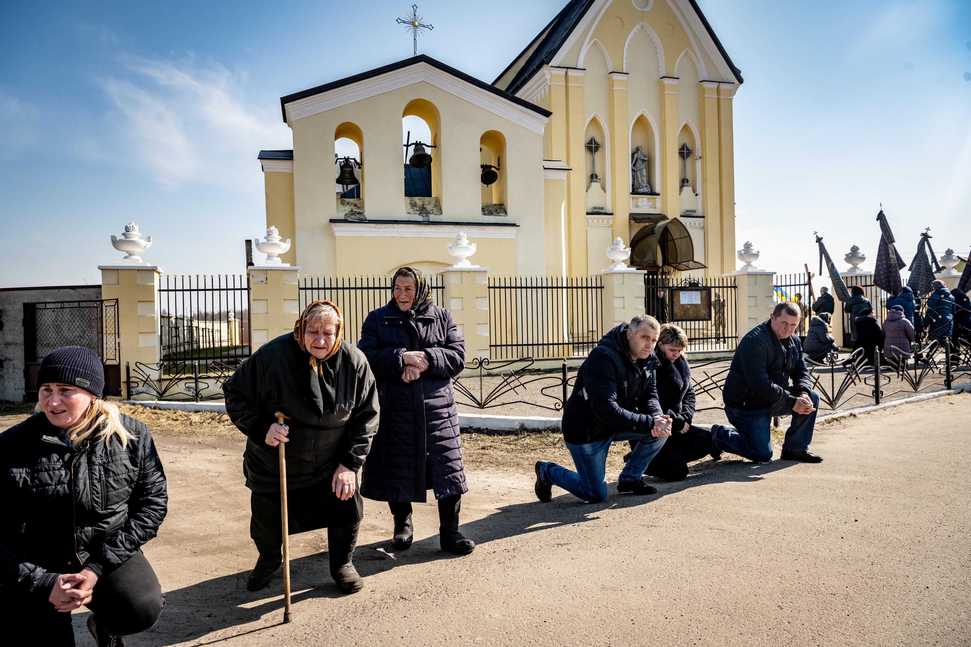 The crowd says the Lord's Prayer. It's in Ukrainian, but its cadence is recognisable and, as they make the sign of the cross from their forehead to chest, Bogdan's family is again overcome with emotion.