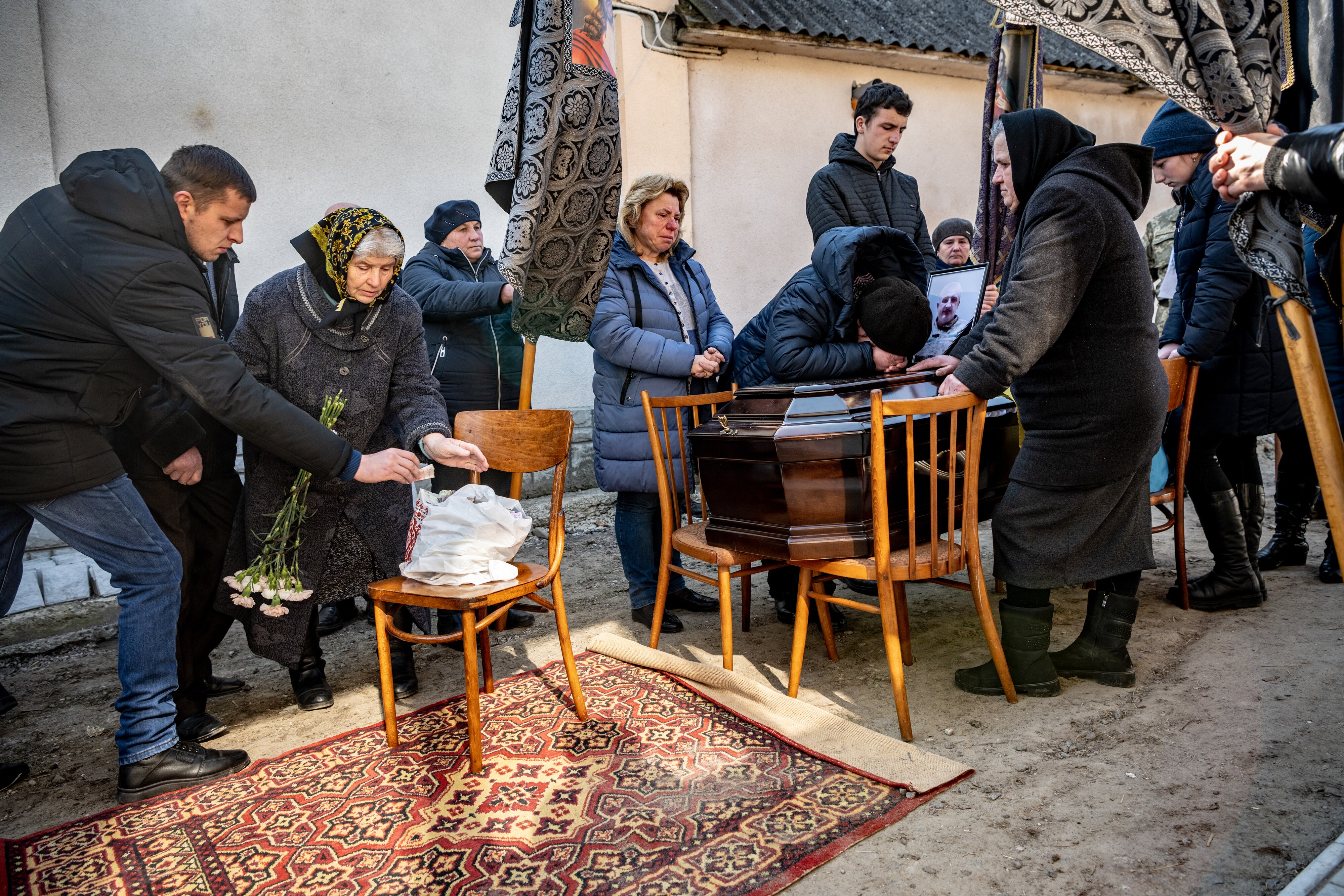 In a small laneway, Bogdan's casket is positioned on kitchen chairs — his devastated wife lain across it. Her hands stay clasped to her face for most of the day.