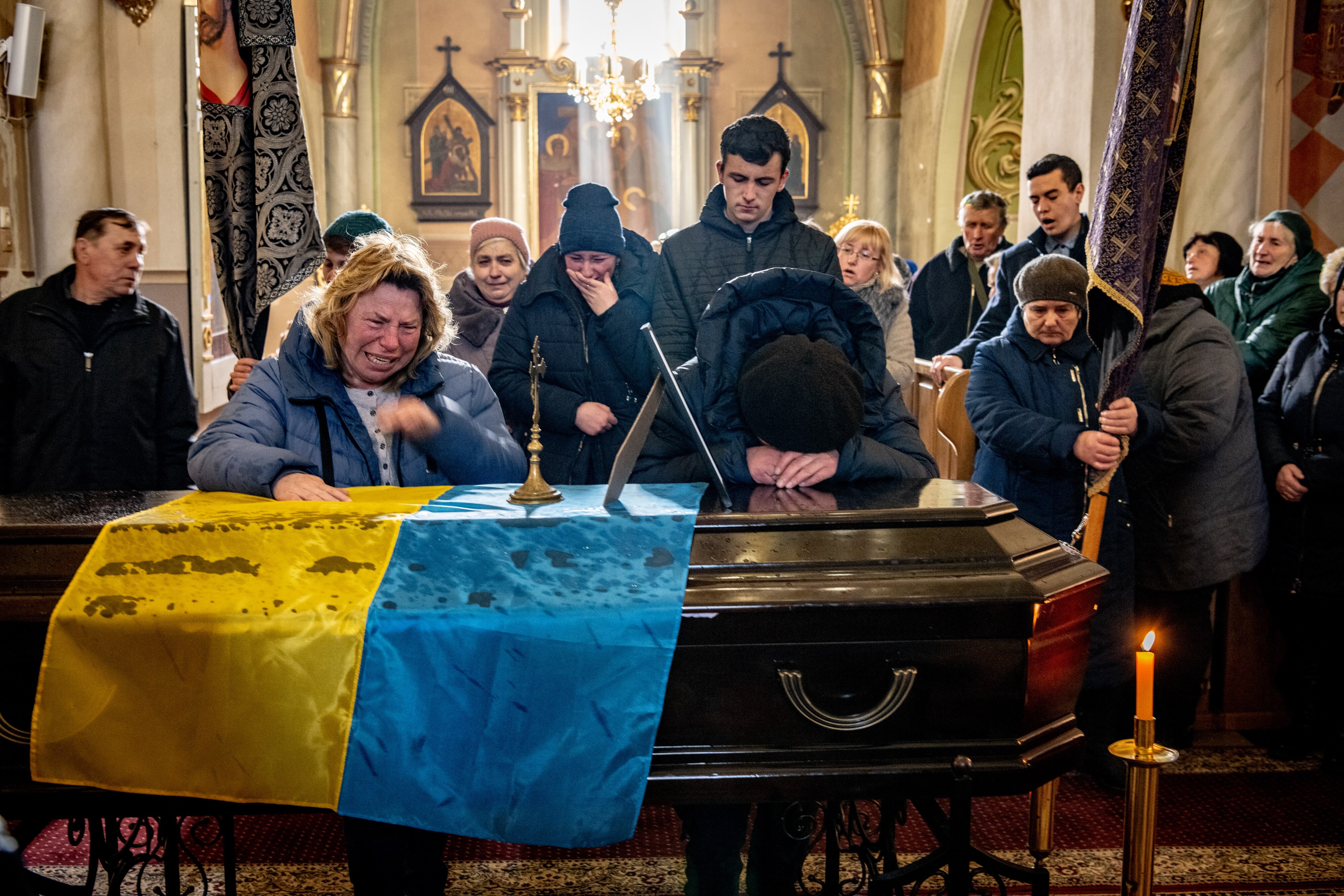 Prayers are said, psalms are chanted and as the last person files past Bogdan's casket, an air raid siren sounds. No-one moves or takes shelter, the war can wait.