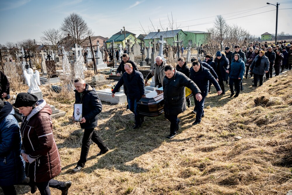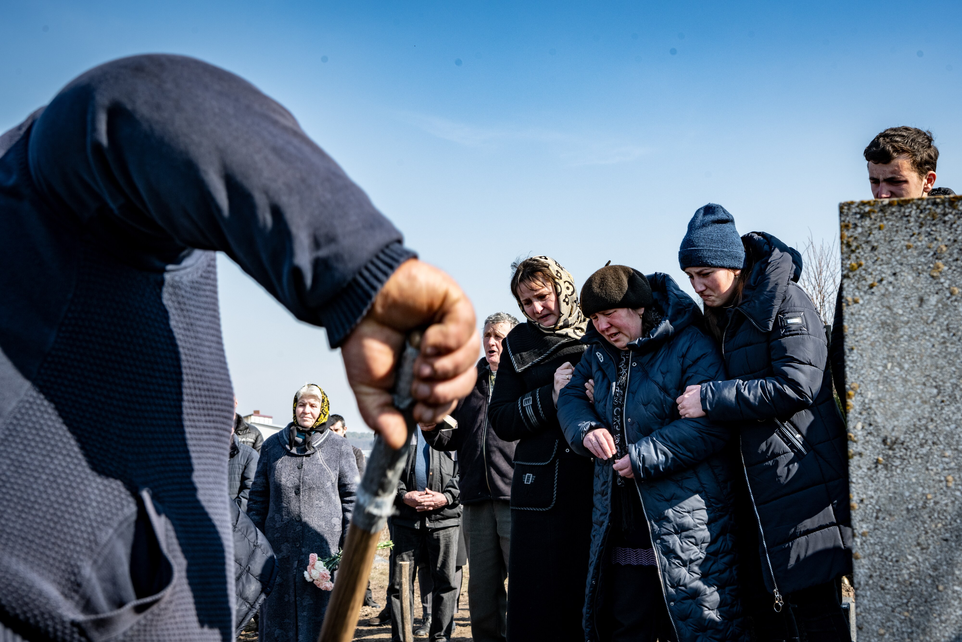 As the soil around Bogdan’s grave is turned and shovelled onto his casket, the gathering starts to sing the Ukrainian national anthem and village leader Vasil steps forward with some closing comments.