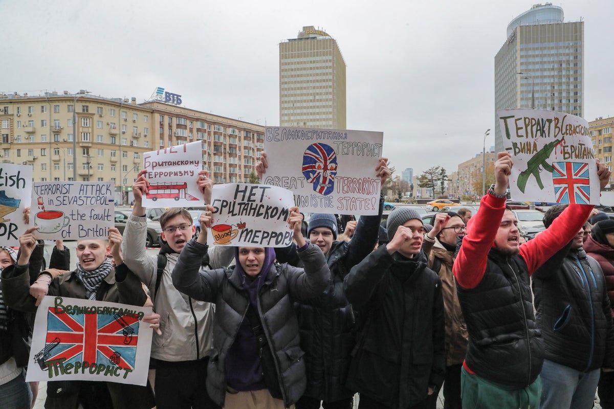 Other makeshift signs, emblazoned with crude drawings of the Union Jack flag, cups of tea, guns, Big Ben and red double decker buses, bore the words “No British terror” and “Terror attack in Sevastopol is Britain’s fault.”