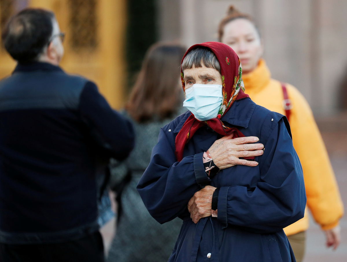 FILE PHOTO: A woman wearing a protective face mask amid the outbreak of the coronavirus disease (COVID-19), walks on a sunny but cold day in central Kyiv, Ukraine November 10, 2020. REUTERS/Gleb Garanich