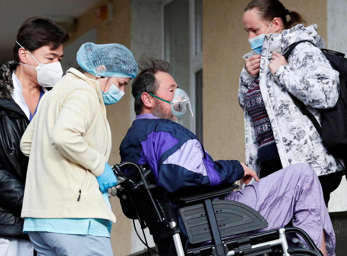 A medical specialist assists a patient outside a hospital for people infected with the coronavirus disease (COVID-19) in Kyiv, Ukraine November 24, 2020. REUTERS/Gleb Garanich