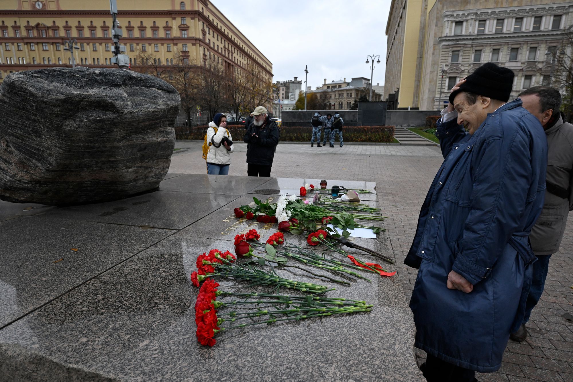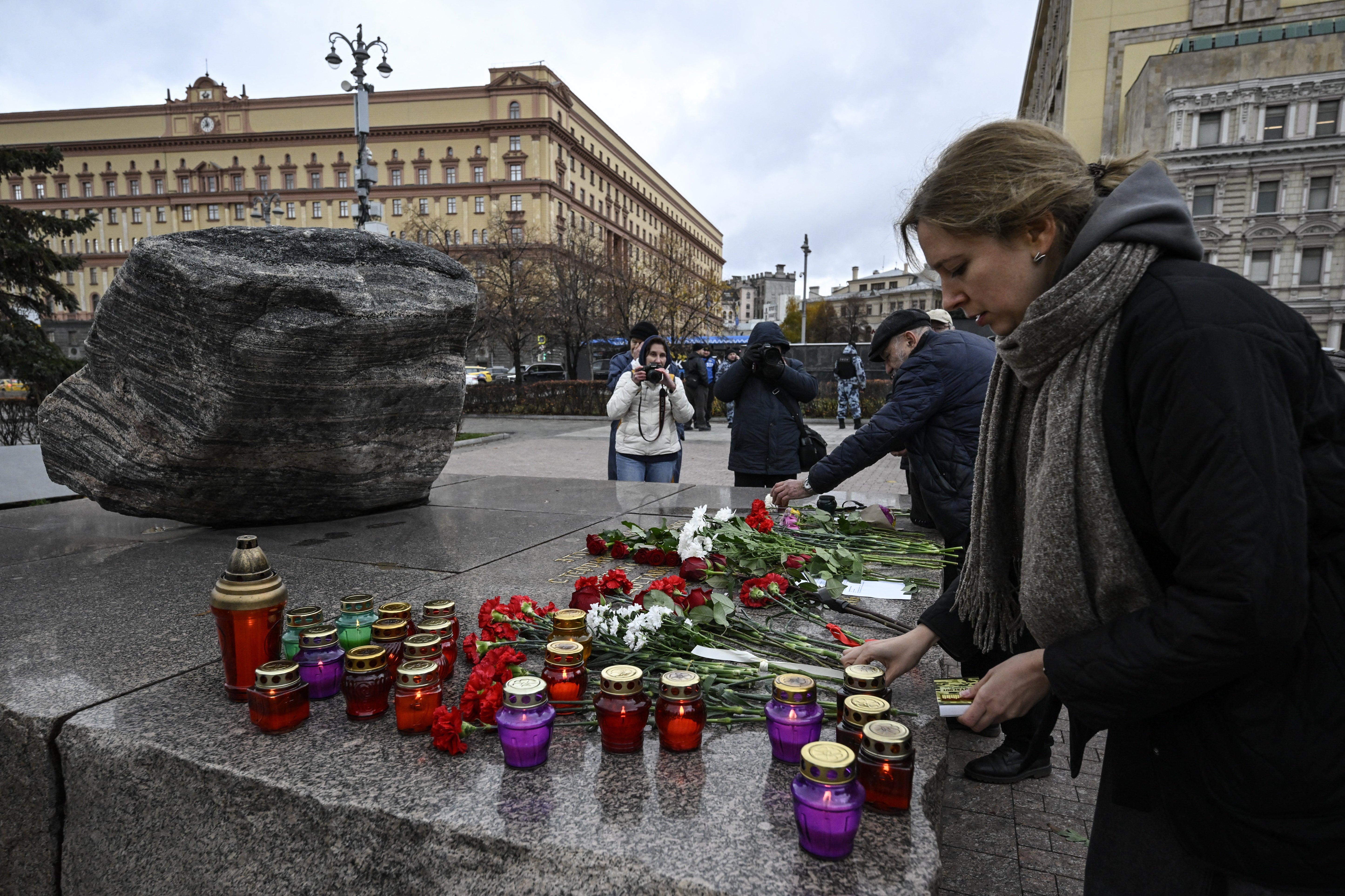 Pictured: People lay flowers at a monument for the victims of political repression in Moscow