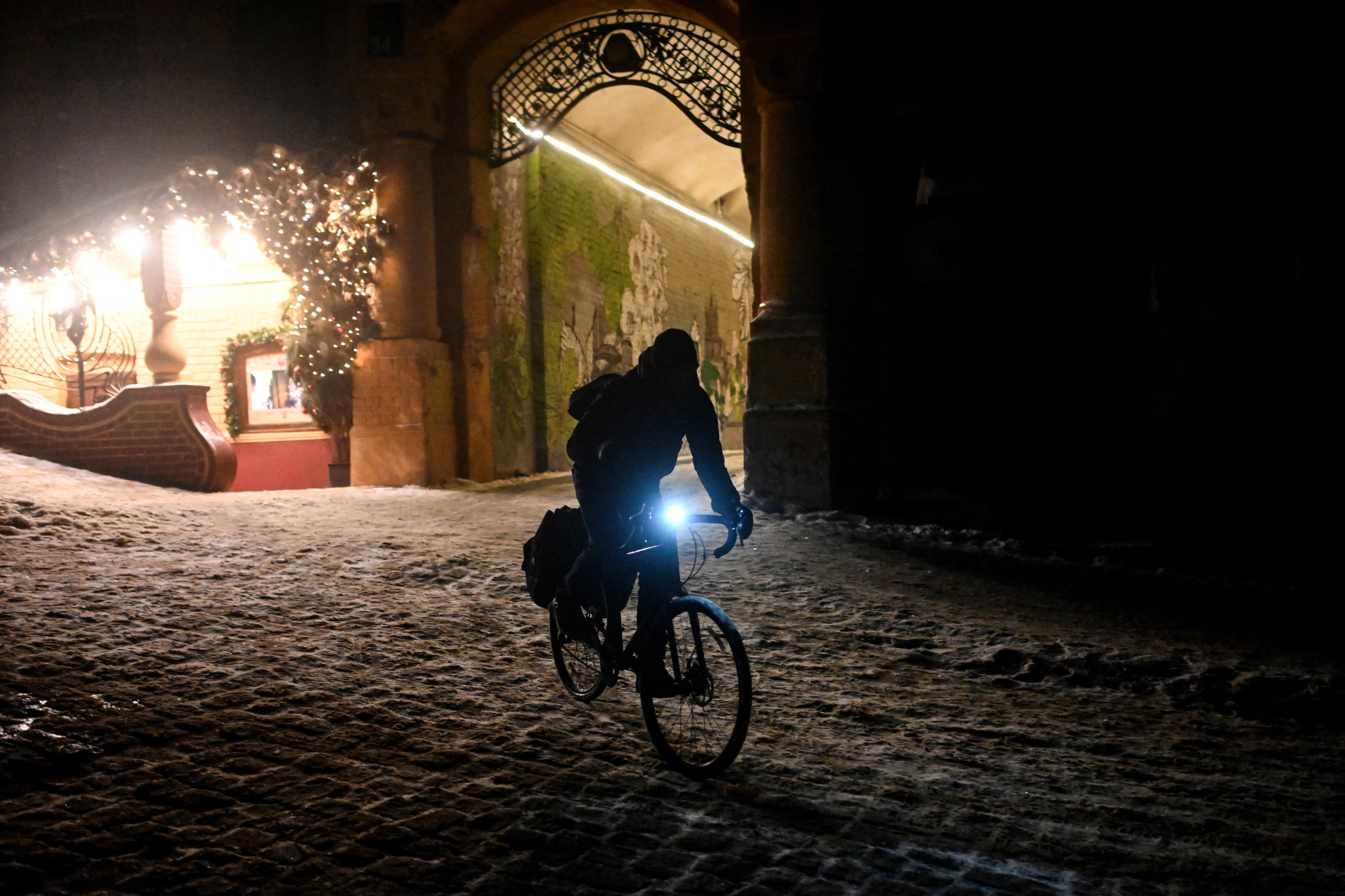 Across Kyiv, snow covers the ground and roofs and is piled up next to pavements. At night, the streets are dark and towering apartment blocks show no light in the windows.