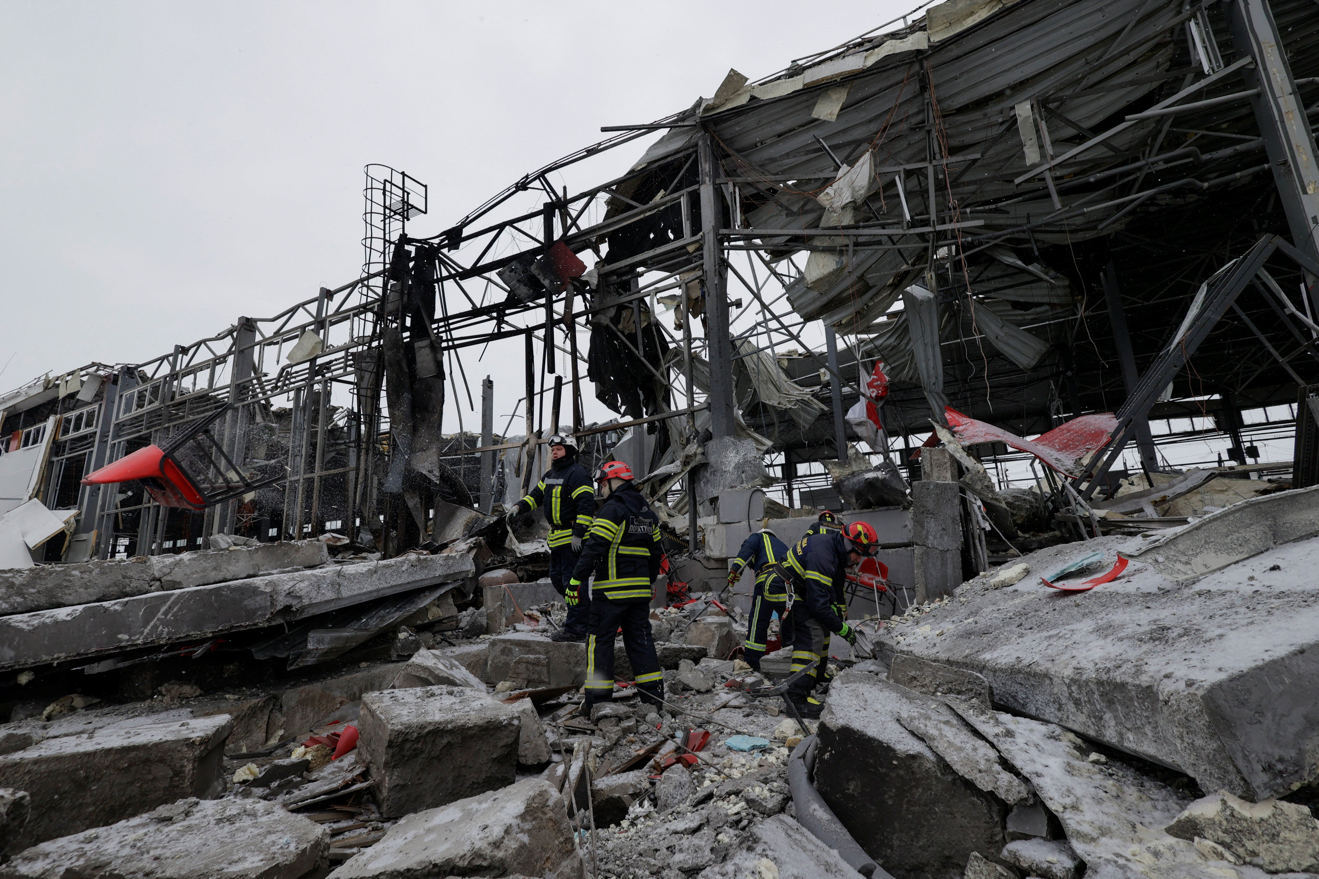 Pictured: Rescuers work at site of logistics hub hit by Russian strike in Kharkiv