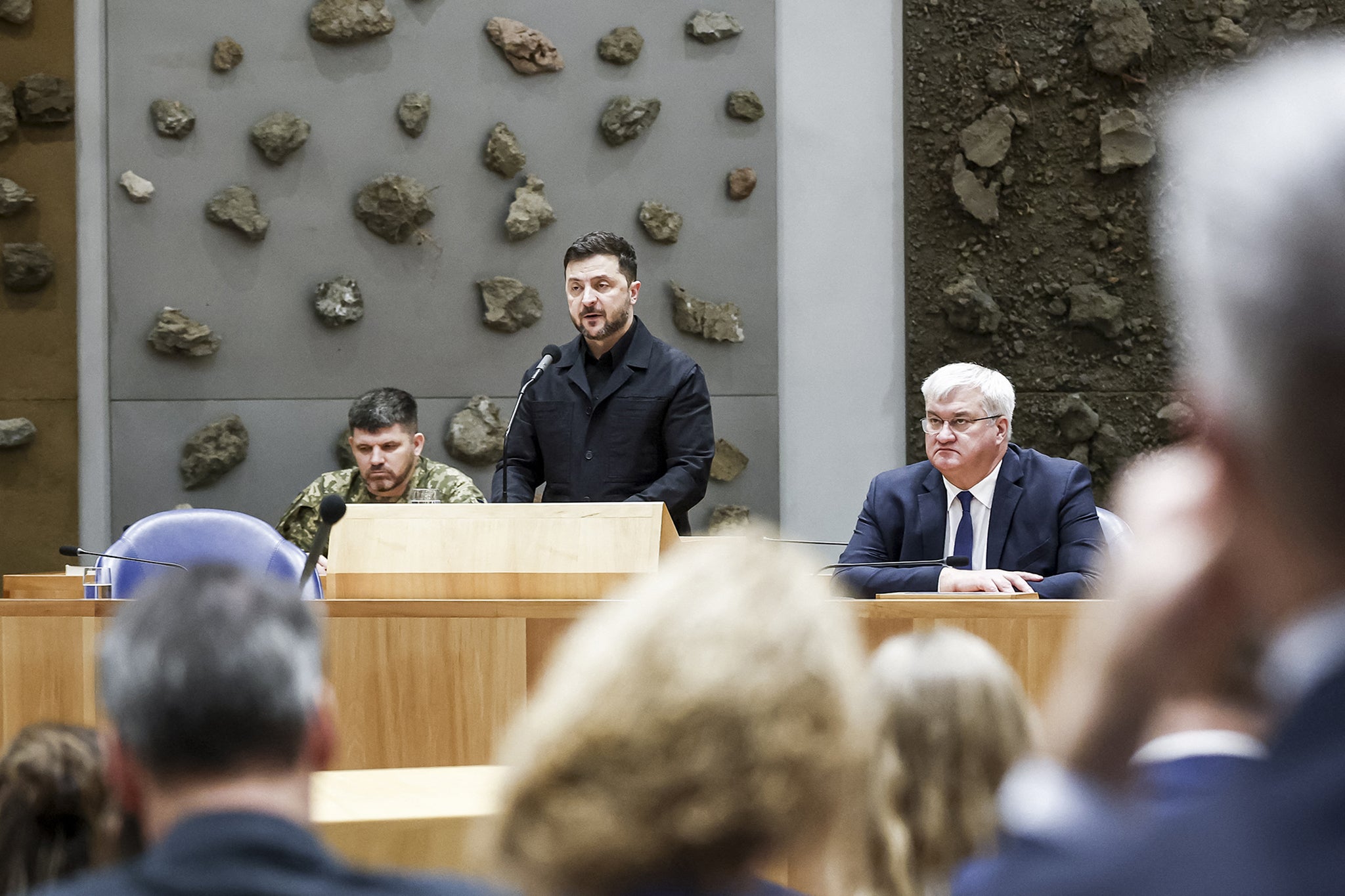 Zelensky delivered a speech to the Dutch parliament, saying the war in Ukraine “must become a clear example so that others learn not to choose aggression”.