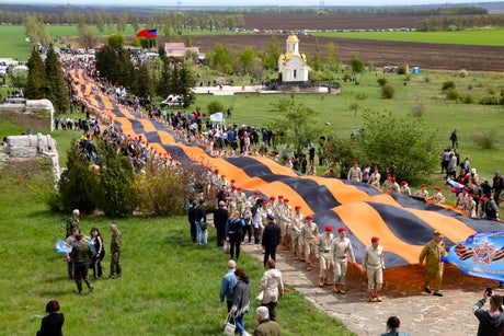 At the Saur-Mogila war memorial in Ukraine's rebel-held territory, demonstrators unfurled a 300-meter (1,000-foot) brown-and-orange banner — the colors of the ribbon on the medal given to Soviet soldiers who served in World War II.
