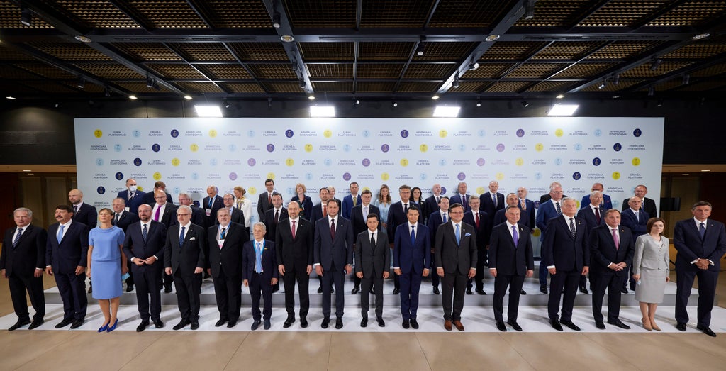 Top officials from 46 countries and blocs took part in the summit, including from the United States, the European Union and Turkey. Kremlin spokesman Dmitry Peskov denounced the summit as an “anti-Russian event.”