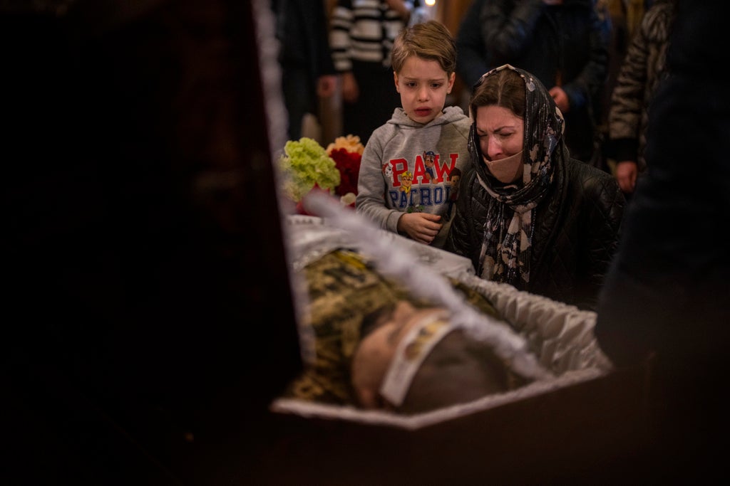 EM101 - A woman and a boy react next to the body of Ukrainian Army captain Anton Sydorov, 35, killed in eastern Ukraine, during his funeral, in Kyiv, Ukraine