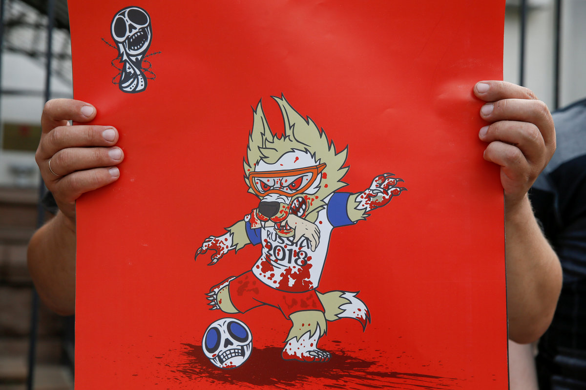 KIEV (Reuters) - Soccer players at the World Cup will not be kicking skulls around the field, but that is what they are doing in posters created by a Ukrainian artist as a protest against the event being held in Russia.