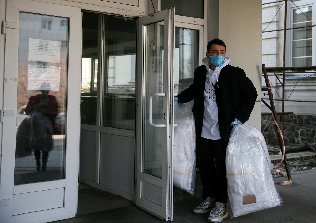 Ukrainian fashion designer Ivan Frolov holds a bag with medical protective coveralls as he stands near the entrance of a hospital in Kiev, Ukraine April 2, 2020. Designer Frolov postponed his work on a new collection and dedicated all of his resources to sewing protective coveralls for doctors, who keep providing medical services to patients affected by coronavirus disease (COVID-19). . REUTERS/Gleb GaranichA view shows bottles containing disinfectant in the show room of Ukrainian fashion designer Ivan Frolov in Kiev, Ukraine April 1, 2020. Designer Frolov postponed his work on a new collection and dedicated all of his resources to sewing protective coveralls for doctors, who keep providing medical services to patients affected by coronavirus disease (COVID-19). Picture taken April 1, 2020. REUTERS/Gleb GaranichEmployees sew medical protective coveralls in the show room of Ukrainian fashion designer Ivan Frolov in Kiev, Ukraine April 1, 2020. Designer Frolov postponed his work on a new collection and dedicated all of his resources to sewing protective coveralls for doctors, who keep providing medical services to patients affected by coronavirus disease (COVID-19). Picture taken April 1, 2020. REUTERS/Gleb GaranichUkrainian fashion designer Ivan Frolov inspects a medical protective coverall in his show room in Kiev, Ukraine April 1, 2020. Designer Frolov postponed his work on a new collection and dedicated all of his resources to sewing protective coveralls for doctors, who keep providing medical services to patients affected by coronavirus disease (COVID-19). Picture taken April 1, 2020. REUTERS/Gleb Garanich