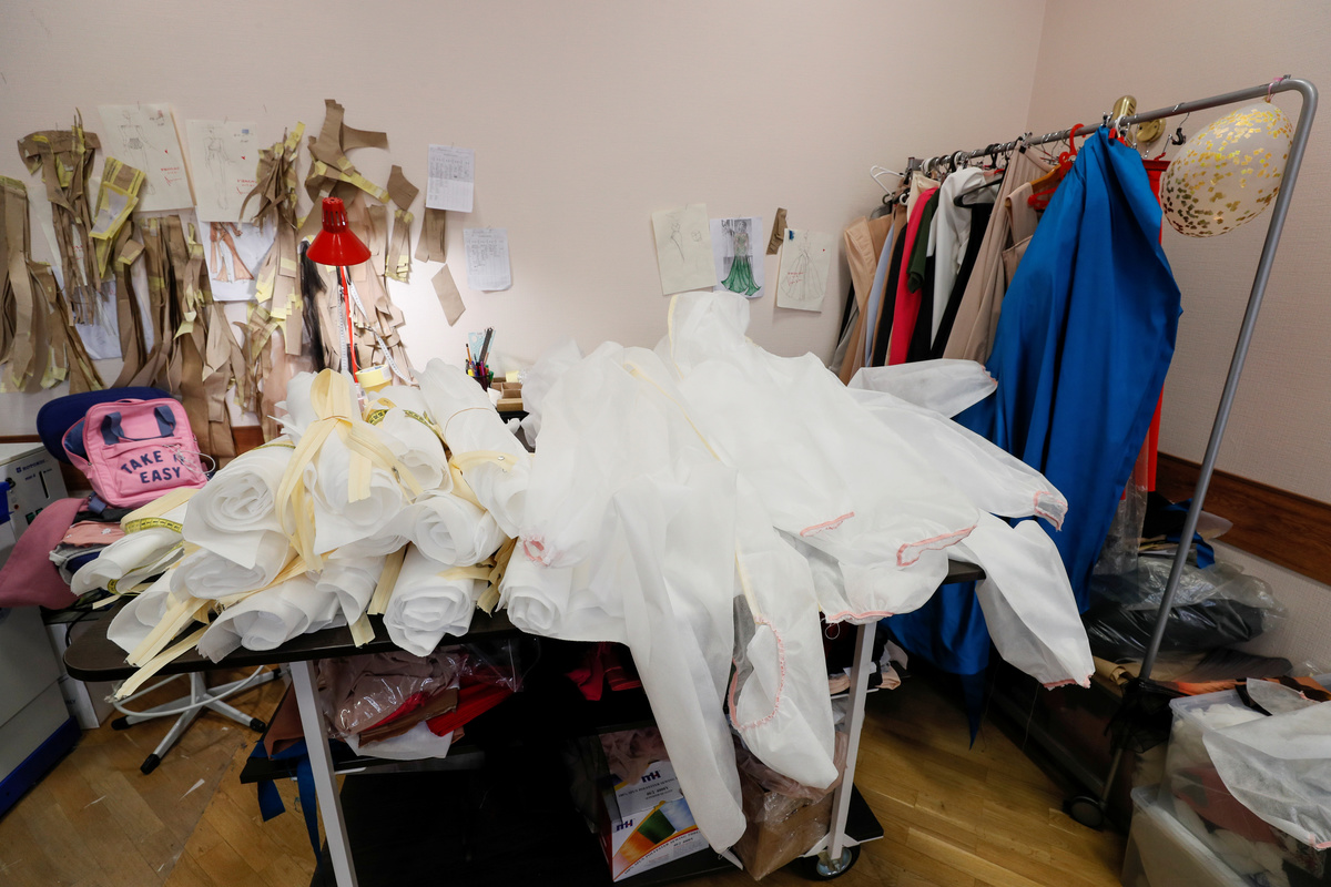 A view shows medical protective coveralls in the show room of Ukrainian fashion designer Ivan Frolov in Kiev, Ukraine April 1, 2020. Designer Frolov postponed his work on a new collection and dedicated all of his resources to sewing protective coveralls for doctors, who keep providing medical services to patients affected by coronavirus disease (COVID-19). Picture taken April 1, 2020. REUTERS/Gleb Garanich