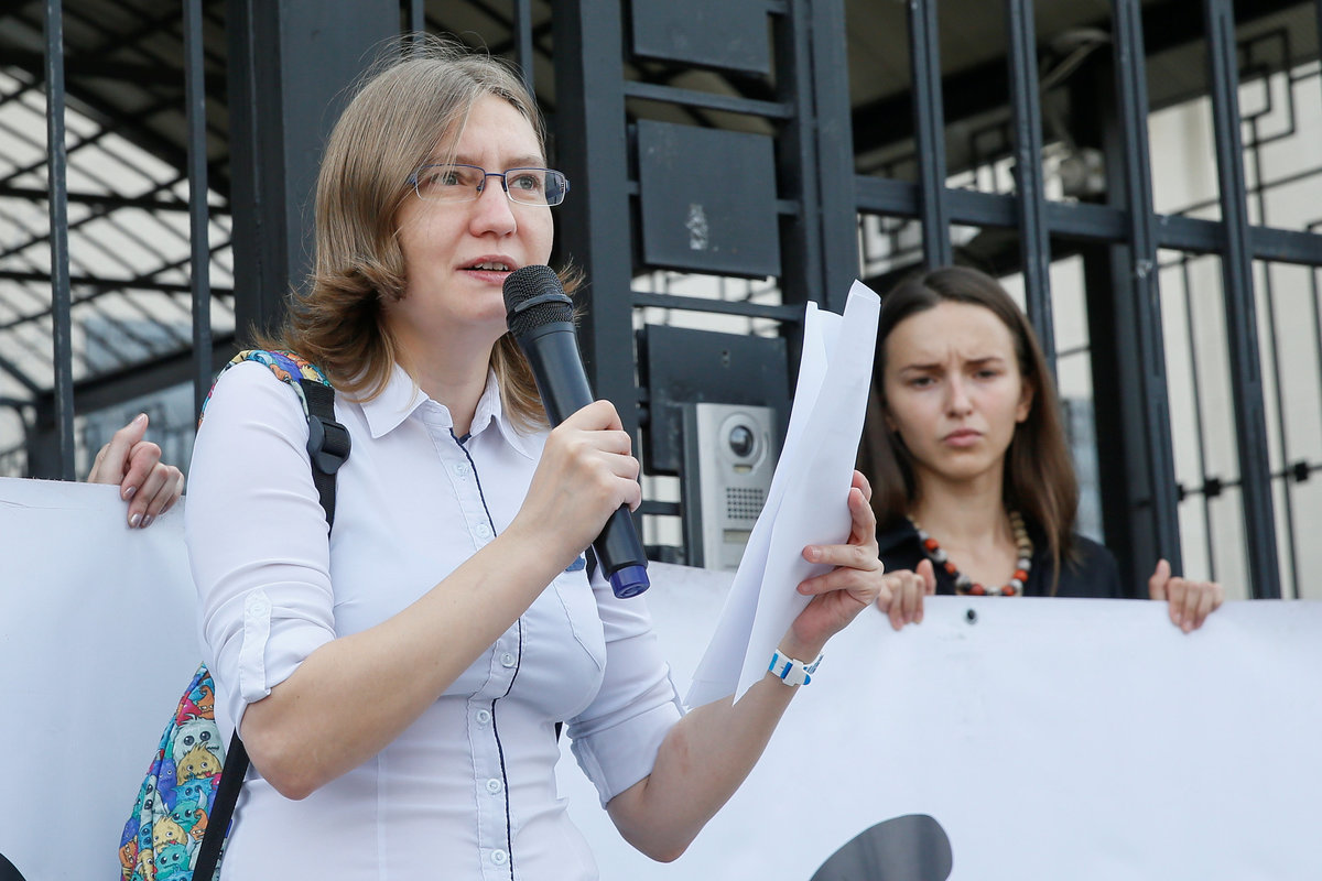 Natalya Kaplan, cousin of Ukrainian film director Oleg Sentsov, delivers a speech during a rally demanding the release of Sentsov, who was jailed on terrorism charges and is currently on hunger strike in Russian jail, in front of the Russian embassy in Kiev, Ukraine August 21, 2018. Picture taken August 21, 2018. REUTERS/Valentyn Ogirenko