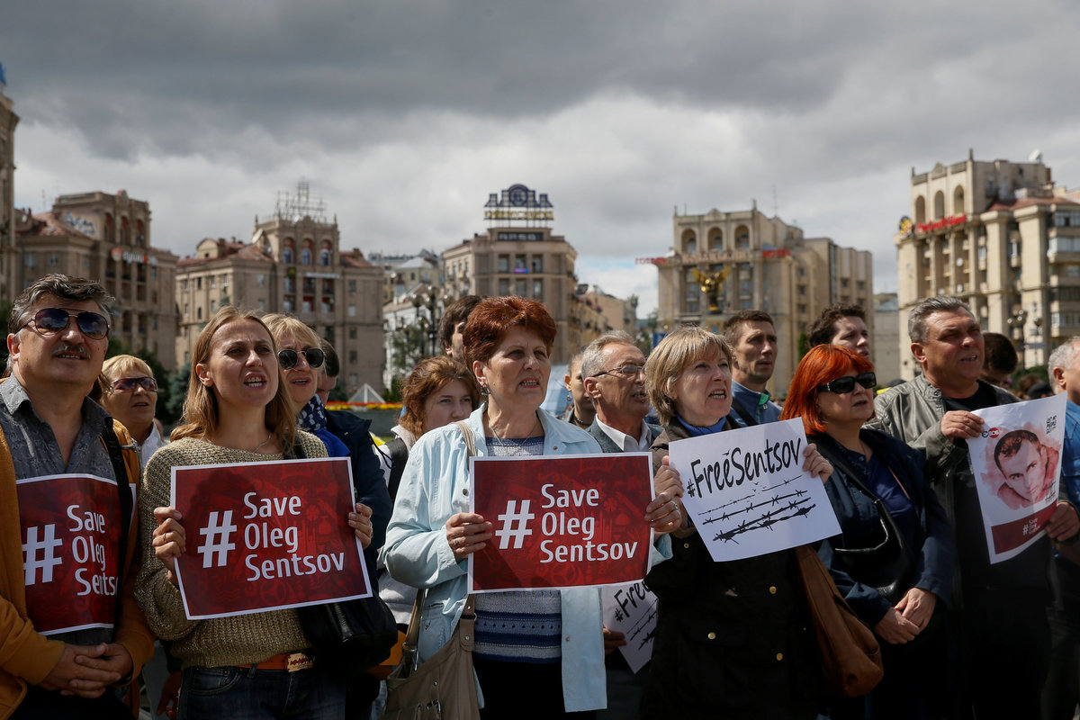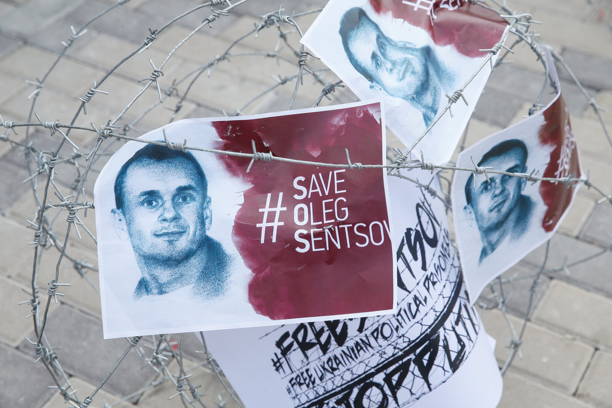 FILE PHOTO: Barbed wire and placards with images of Ukrainian film director Oleg Sentsov are seen after a rally demanding the release of Sentsov, who was jailed on terrorism charges and is currently on hunger strike in Russian jail, in front of the Russian embassy in Kiev, Ukraine August 21, 2018. REUTERS/Valentyn Ogirenko/File PhotoFILE PHOTO: A participant attends a rally demanding the release of film director Oleg Sentsov and other Ukrainian political prisoners in Russia, at the Independence Square in Kiev, Ukraine July 13, 2018. REUTERS/Valentyn Ogirenko/File PhotoFILE PHOTO: A view shows barbed wire and a placard during a rally demanding the release of Ukrainian film director Oleg Sentsov, who was jailed on terrorism charges and is currently on hunger strike in Russian jail, in front of the Russian embassy in Kiev, Ukraine August 21, 2018. REUTERS/Valentyn Ogirenko/File Photo