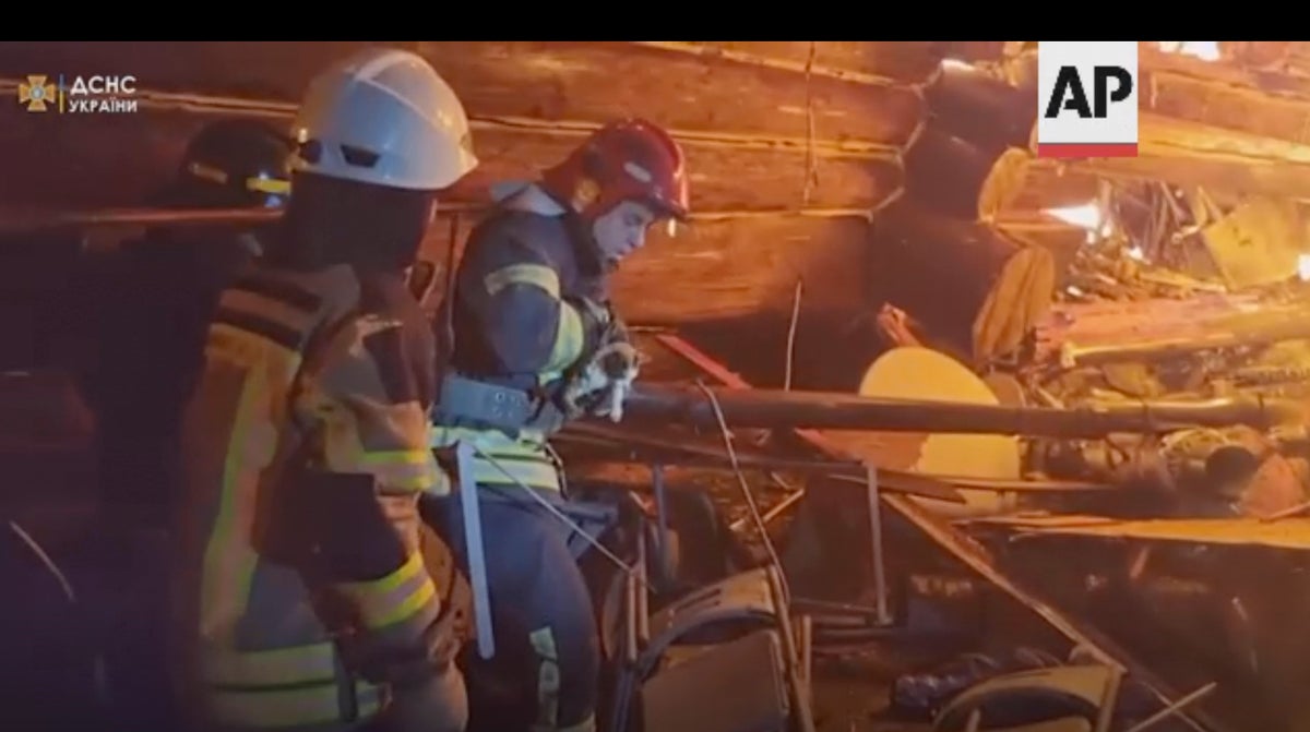 The rescuers, wearing full firefighting gear, battled raging flames and smoke to pull the kitten out from under a metal chair in the rubble of a large wooden hotel-restaurant complex hit by a rocket in Ukraine's second-largest city, Kharkiv, the country's emergency services said Sunday on Facebook.