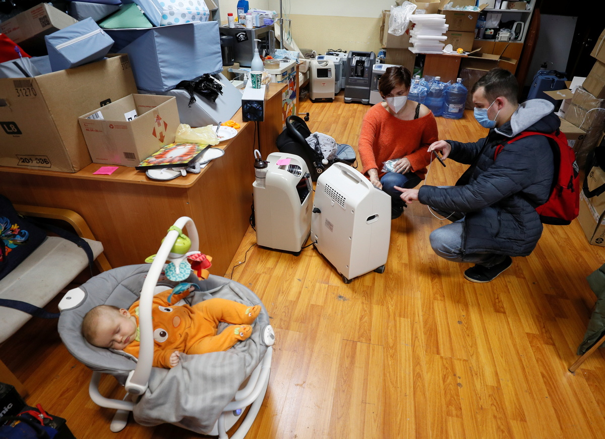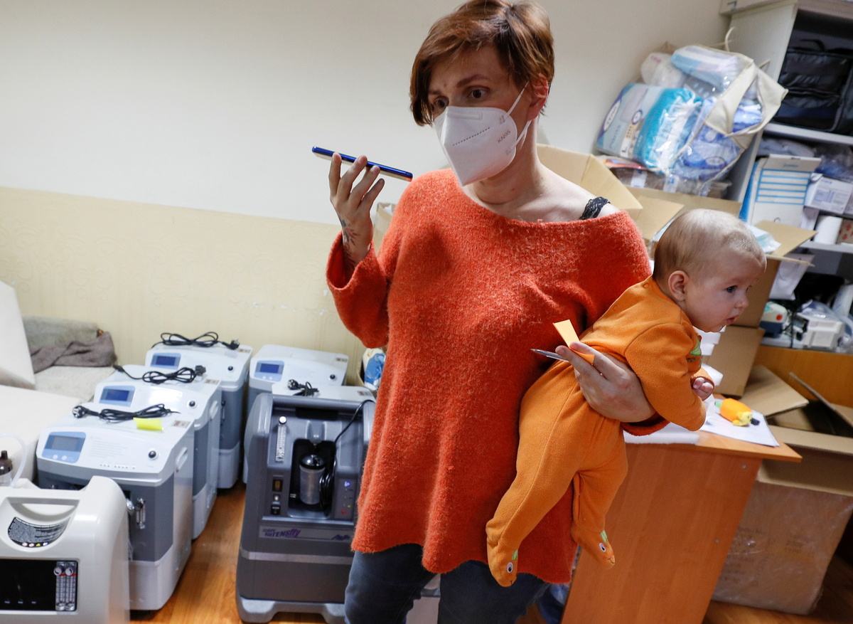 Lesya Lytvynova's phone never stops ringing. With one hand she soothes her three-month-old baby, with the other she answers calls from relatives of coronavirus patients desperate to get an oxygen generator.