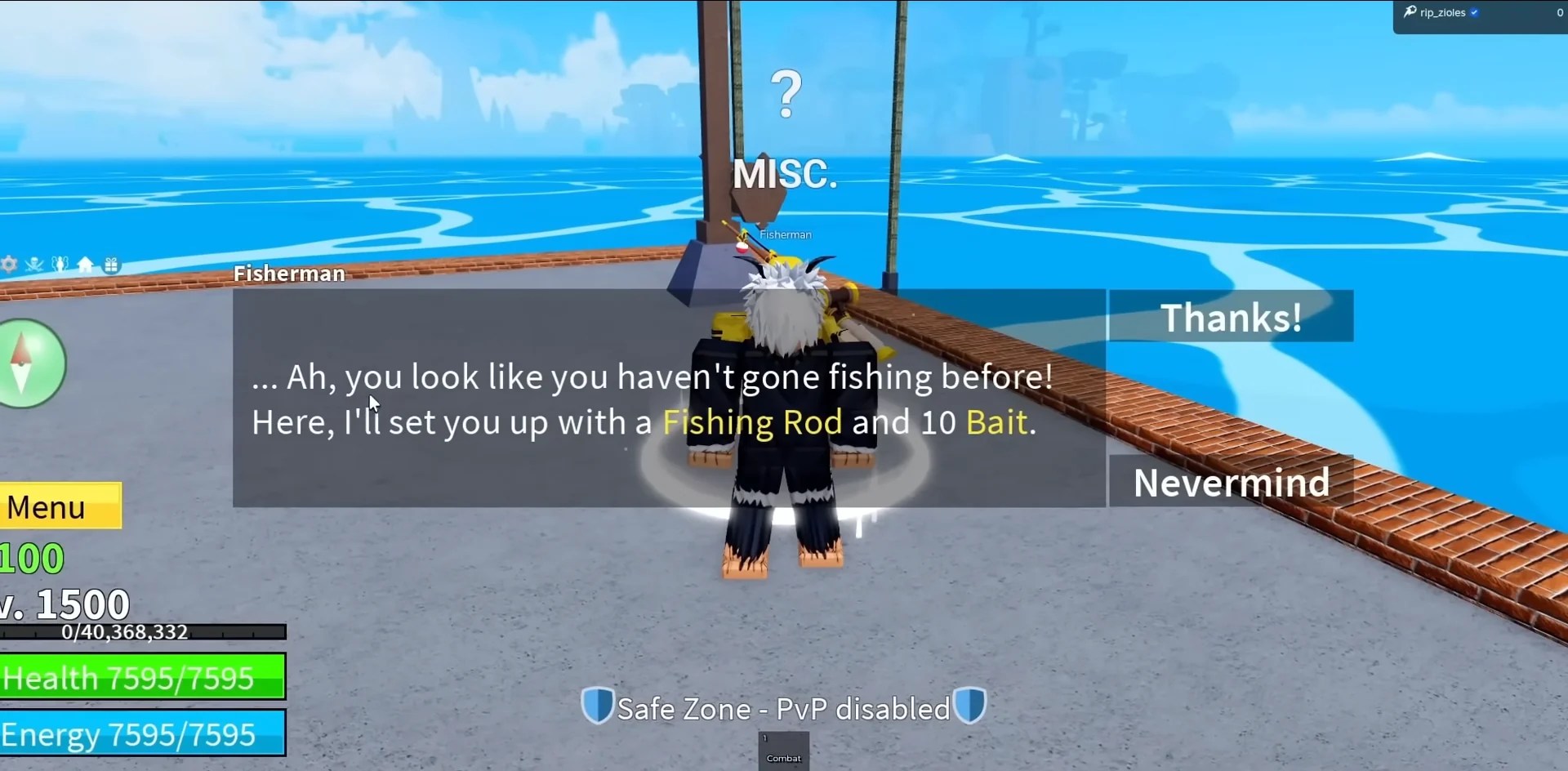 Before you can start fishing in Blox Fruits, you first need to get a rod and bait. Starting Fishing Rod and Basic Bait (x10) can be acquired by talking to any Fisherman NPC for the first time. You can find a Fisherman NPC at the docks of Port Town, the starting island in the Third Sea. Fisherman NPCs can be found in the First and Second Seas as well.