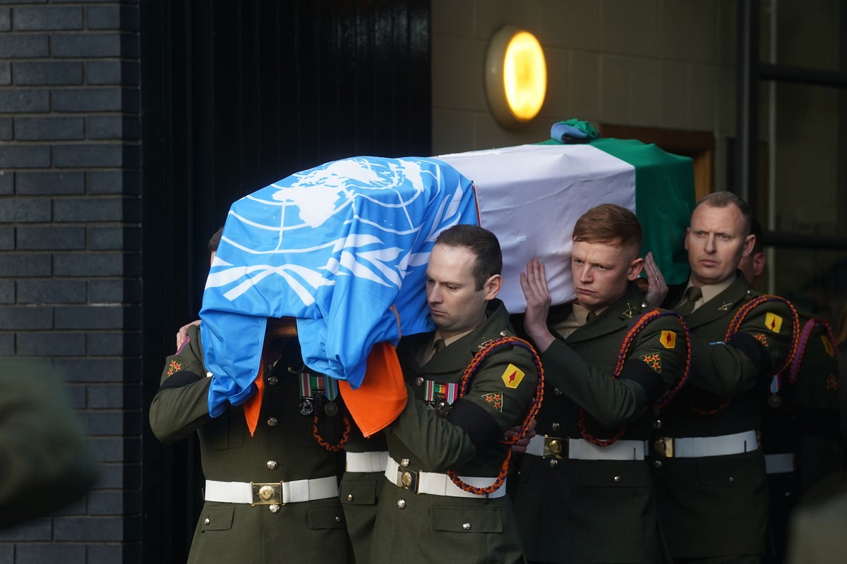 Mourners at Holy Family Church, including Irish President Michael D Higgins, Irish premier Leo Varadkar, Tanaiste Micheal Martin and Garda Commissioner Drew Harris, as well as some of Pte Rooney’s colleagues from Lebanon, hear him described as a “national hero”.