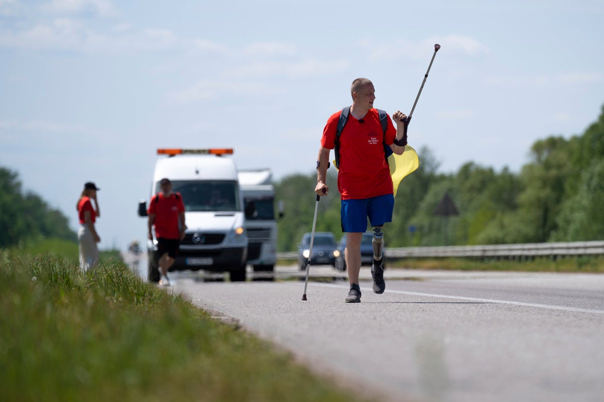 Khrapko, missing an arm and running with one prosthetic leg, left Kyiv on May 15 at 3:05 p.m. Shevtsov, who has a prosthetic leg, had begun the race from Zhytomyr three hours earlier. Five days later they met on the road, having walked a total of 165,156 steps toward each other over five days.