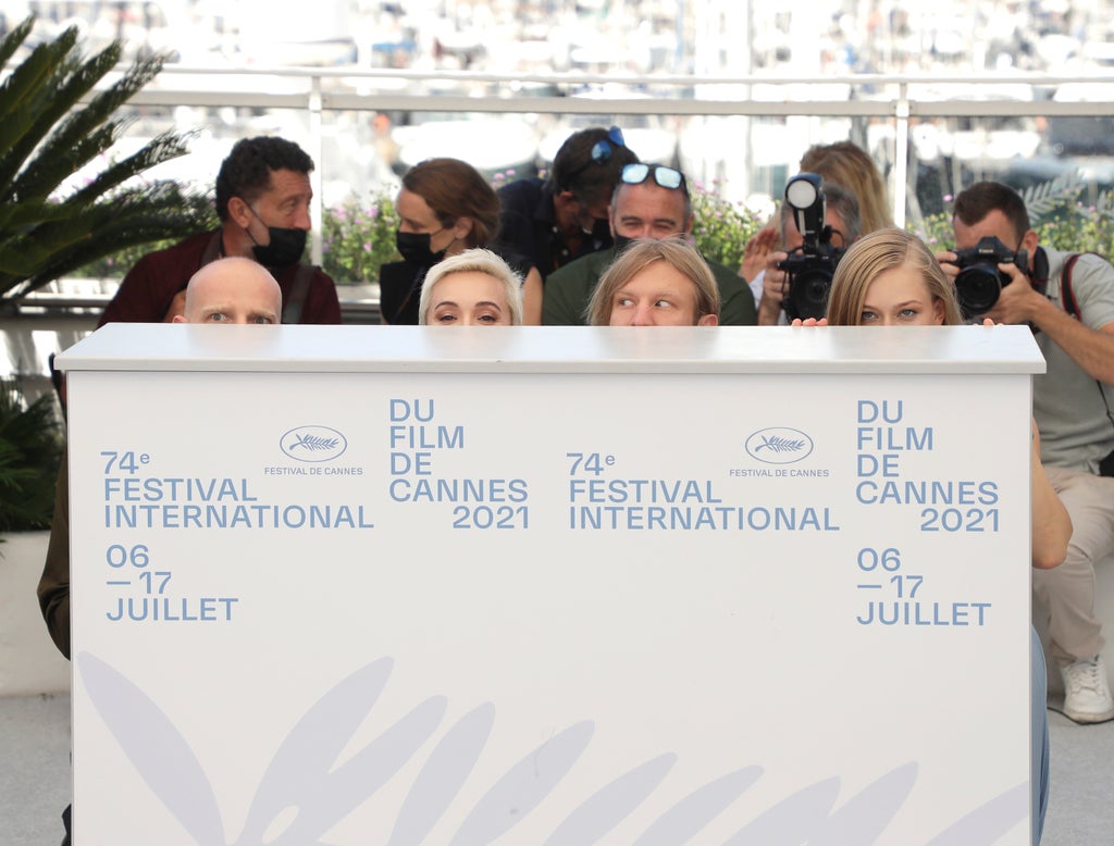 On the Cannes red carpet, cast members and producers wore badges with the director’s photo and initials.