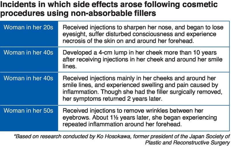 Cosmetic filler injections are one of the minor cosmetic surgery procedures called "petit seikei," which are popular because they do not involve going under the surgeon's knife. However, most of the substances used in such injections are unapproved in Japan and their safety is yet to be confirmed, according to sources.