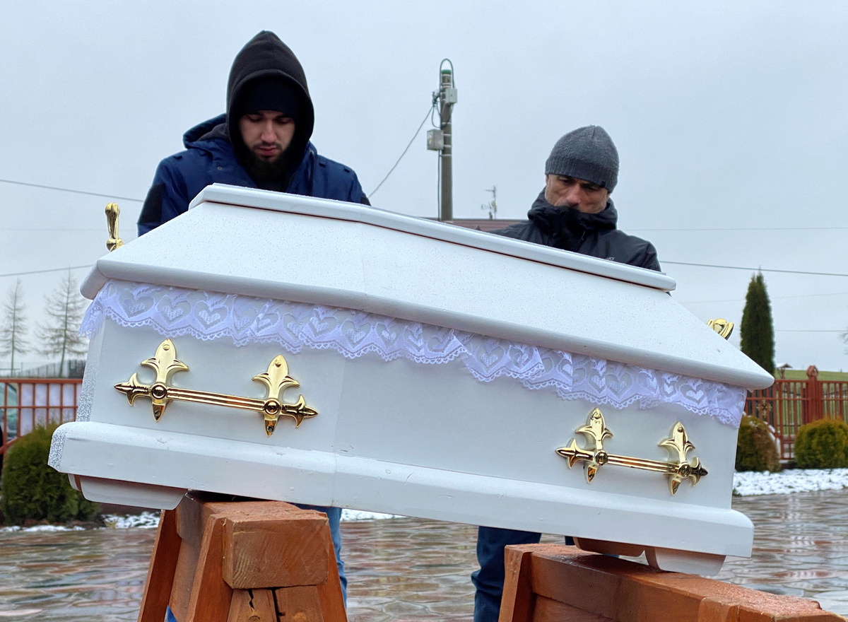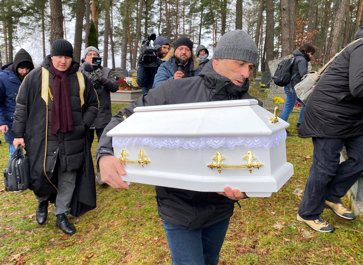 In a tiny white coffin, the body of an unborn child that died in the womb of its mother as she tried to cross from Belarus into the European Union was buried in a Muslim cemetery in north-east Poland on Tuesday.