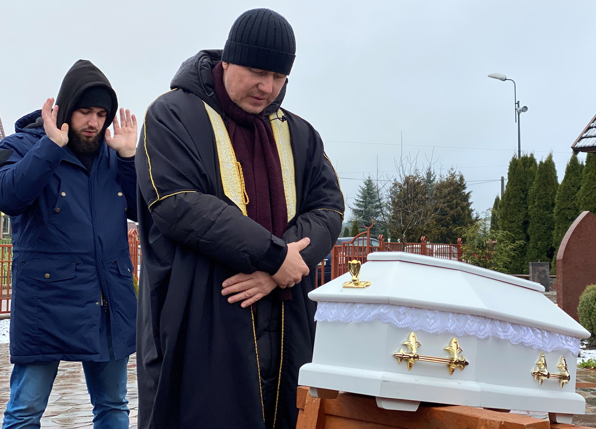 As the first snow of winter lay on fields around the cemetery, the coffin was lowered into the ground by Bazarewicz and a Chechen Muslim man who took part in the funeral.