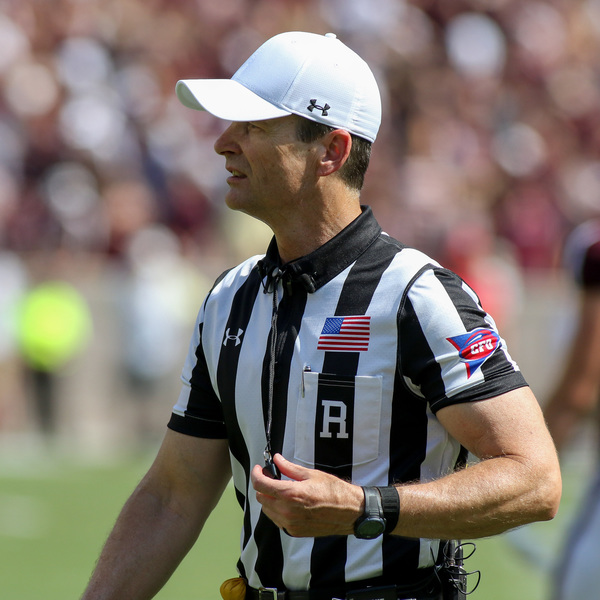 During each of the game's 22 penalties, a referee in black-and-white stripes directly faced the camera to announce the infraction and on the front of his uniform, next to an American flag patch, was Under Armour's logo. The interlocking "UA" also appeared on the game officials' backs and caps.