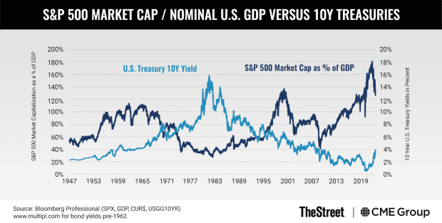 To be certain, the ratio of the S&P 500’s market cap to GDP has fallen from 180% to around 140%. By this measure, stocks are indeed less expensive.