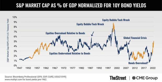 If one adjusts the S&P 500 market cap GDP ratio by the level of 10-year bond yields, one finds the following: Stocks were cheap compared to bonds back in the 1950s and early 1960s, and the same was true during the 2010s. During these times, stocks vastly outperformed bonds. The opposite was true in the year 2000 when stocks were highly overvalued versus bonds; and between 2000 and 2009, stocks fell sharply versus bonds.