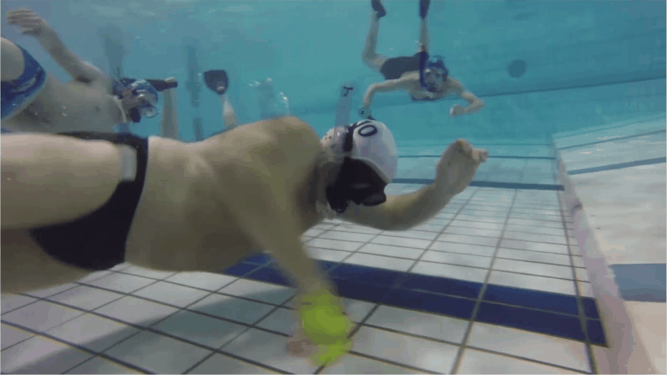 To compete in underwater hockey, players balance a basic physiological need – the need to breathe – with the desire to win. Once you surface, you're effectively taken out of the play: You can no longer receive a pass, defend the goal, or score. In that sense, underwater hockey players compete with their bodies, as well as their opponents.
