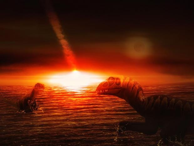 The scientists proposed that the pulse of marine volcanic activity could therefore have played a key role in the environmental crisis that led to the extinction of 75 per cent of all species on Earth at that point – including the dinosaurs.