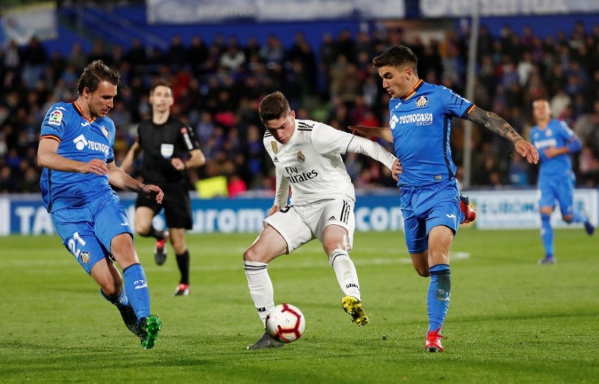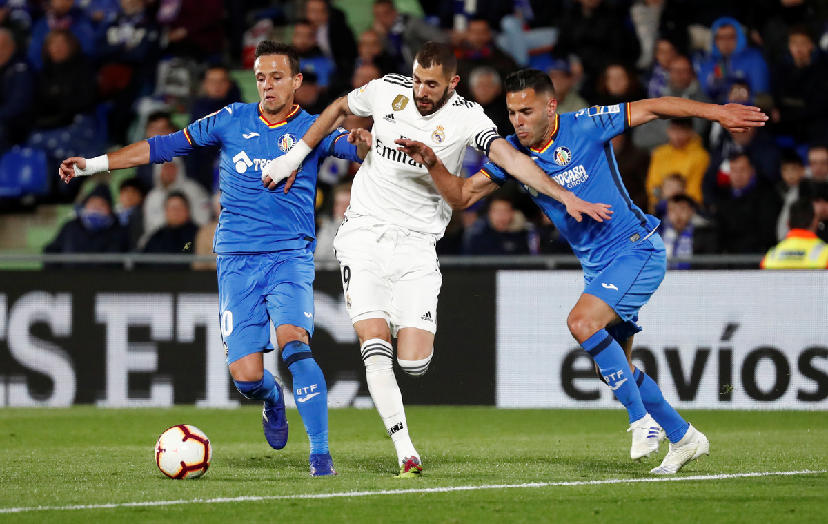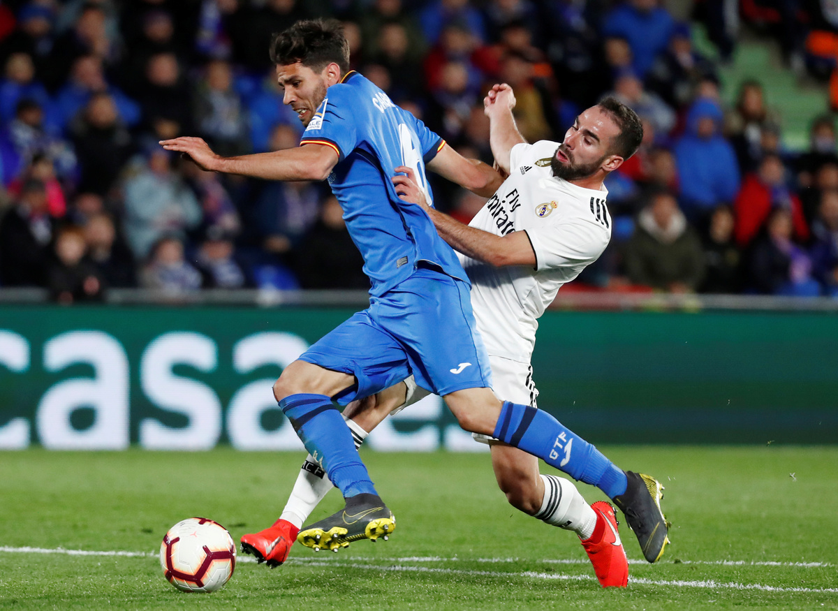 Soccer Football - La Liga Santander - Getafe v Real Madrid - Coliseum Alfonso Perez, Getafe, Spain - April 25, 2019 Real Madrid's Federico Valverde in action with Getafe's Ignasi Miquel REUTERS/Sergio PerezSoccer Football - La Liga Santander - Getafe v Real Madrid - Coliseum Alfonso Perez, Getafe, Spain - April 25, 2019 Getafe's Nemanja Maksimovic and Damian Suarez in action with Real Madrid's Karim Benzema REUTERS/Sergio PerezSoccer Football - La Liga Santander - Getafe v Real Madrid - Coliseum Alfonso Perez, Getafe, Spain - April 25, 2019 Getafe's David Soria in action with Real Madrid's Karim Benzema REUTERS/Sergio PerezSoccer Football - La Liga Santander - Getafe v Real Madrid - Coliseum Alfonso Perez, Getafe, Spain - April 25, 2019 Real Madrid's Brahim Diaz shoots at goal REUTERS/Sergio PerezSoccer Football - La Liga Santander - Getafe v Real Madrid - Coliseum Alfonso Perez, Getafe, Spain - April 25, 2019 Real Madrid's Federico Valverde in action with Getafe's Mauro Arambarri and Ignasi Miquel REUTERS/Sergio PerezSoccer Football - La Liga Santander - Getafe v Real Madrid - Coliseum Alfonso Perez, Getafe, Spain - April 25, 2019 Getafe's Mauro Arambarri in action with Real Madrid's Isco REUTERS/Sergio PerezSoccer Football - La Liga Santander - Getafe v Real Madrid - Coliseum Alfonso Perez, Getafe, Spain - April 25, 2019 Getafe's Hugo Perales in action with Real Madrid's Karim Benzema REUTERS/Sergio PerezSoccer Football - La Liga Santander - Getafe v Real Madrid - Coliseum Alfonso Perez, Getafe, Spain - April 25, 2019 Getafe's Leandro Cabrera in action with Real Madrid's Dani Carvajal REUTERS/Sergio Perez