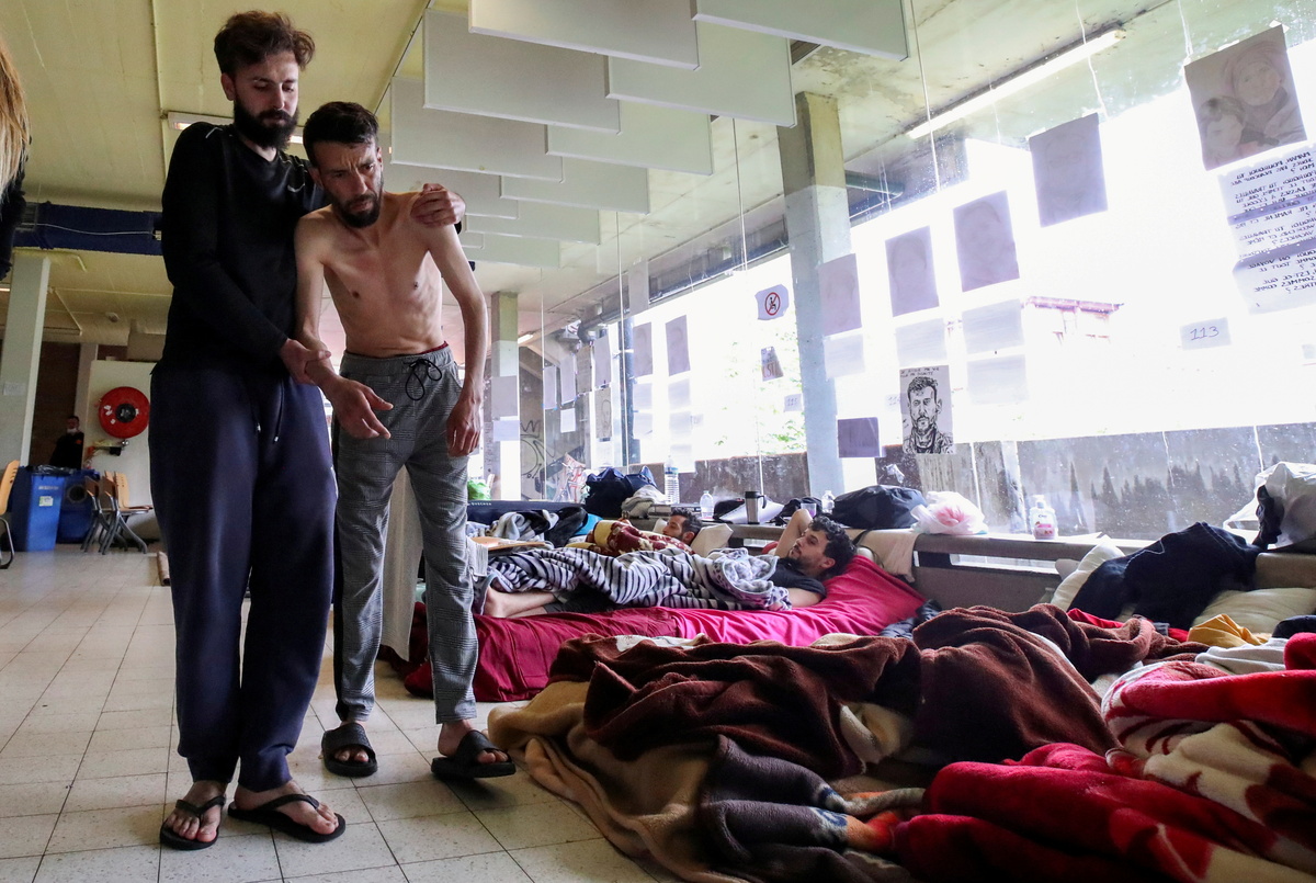 Asylum seekers requesting to be regularised by the Belgian government to have access to healthcare, are seen in a room on the campus of Belgium university ULB, where hundreds of migrants are going on hunger strike for more than a month, in Brussels, Belgium June 29, 2021. REUTERS/Yves Herman