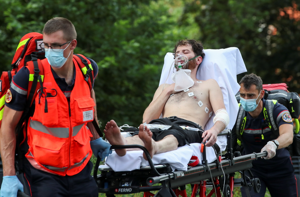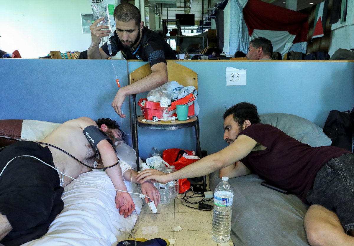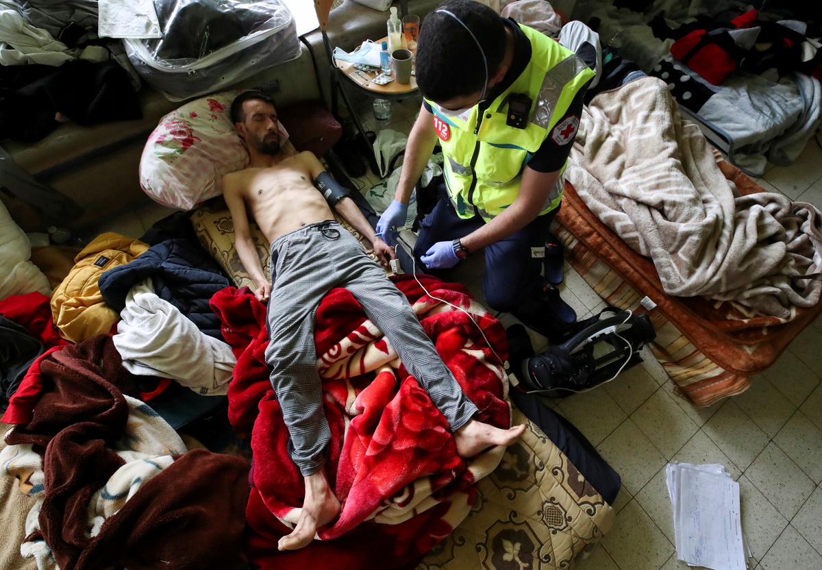 An asylum seeker, requesting to be regularised by the Belgian government to have access to healthcare, and who is going on hunger strike for more than a month, is helped by people before being evacuated to a hospital on the campus of Belgium university ULB, where hundreds of migrants are going on hunger strike, in Brussels, Belgium June 29, 2021. REUTERS/Yves HermanYoussef Bouzidi, a Moroccan asylum seeker, requesting to be regularised by the Belgian government to have access to healthcare, and who is going on hunger strike for more than a month, is examined by a healthcare worker in a room on the campus of Belgium university ULB, where hundreds of migrants are going on hunger strike, in Brussels, Belgium June 29, 2021. REUTERS/Yves Herman An asylum seeker, requesting to be regularised by the Belgian government to have access to healthcare, and who is going on hunger strike for more than a month, is transported to a hospital by healthcare workers on the campus of Belgium university ULB, where hundreds of migrants are going on hunger strike, in Brussels, Belgium June 29, 2021. REUTERS/Yves Herman