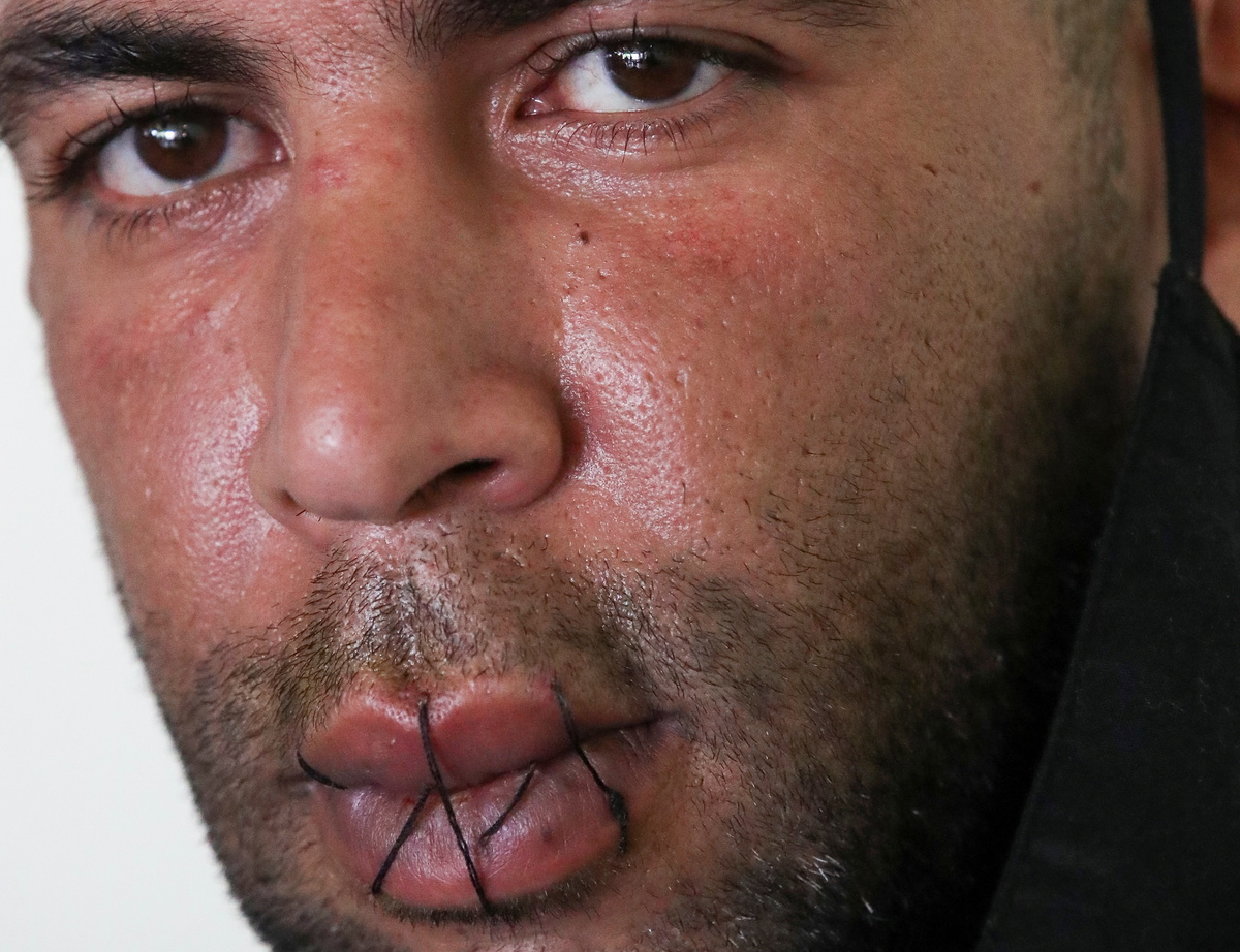 Hasni Abderrazzek, 44, a Tunisian asylum seeker requesting to be regularised by the Belgian government to have access to healthcare, is seen with his lips sewed together in a room on the campus of Belgium university ULB, where hundreds of migrants are going on hunger strike for more than a month, in Brussels, Belgium June 29, 2021. REUTERS/Yves Herman