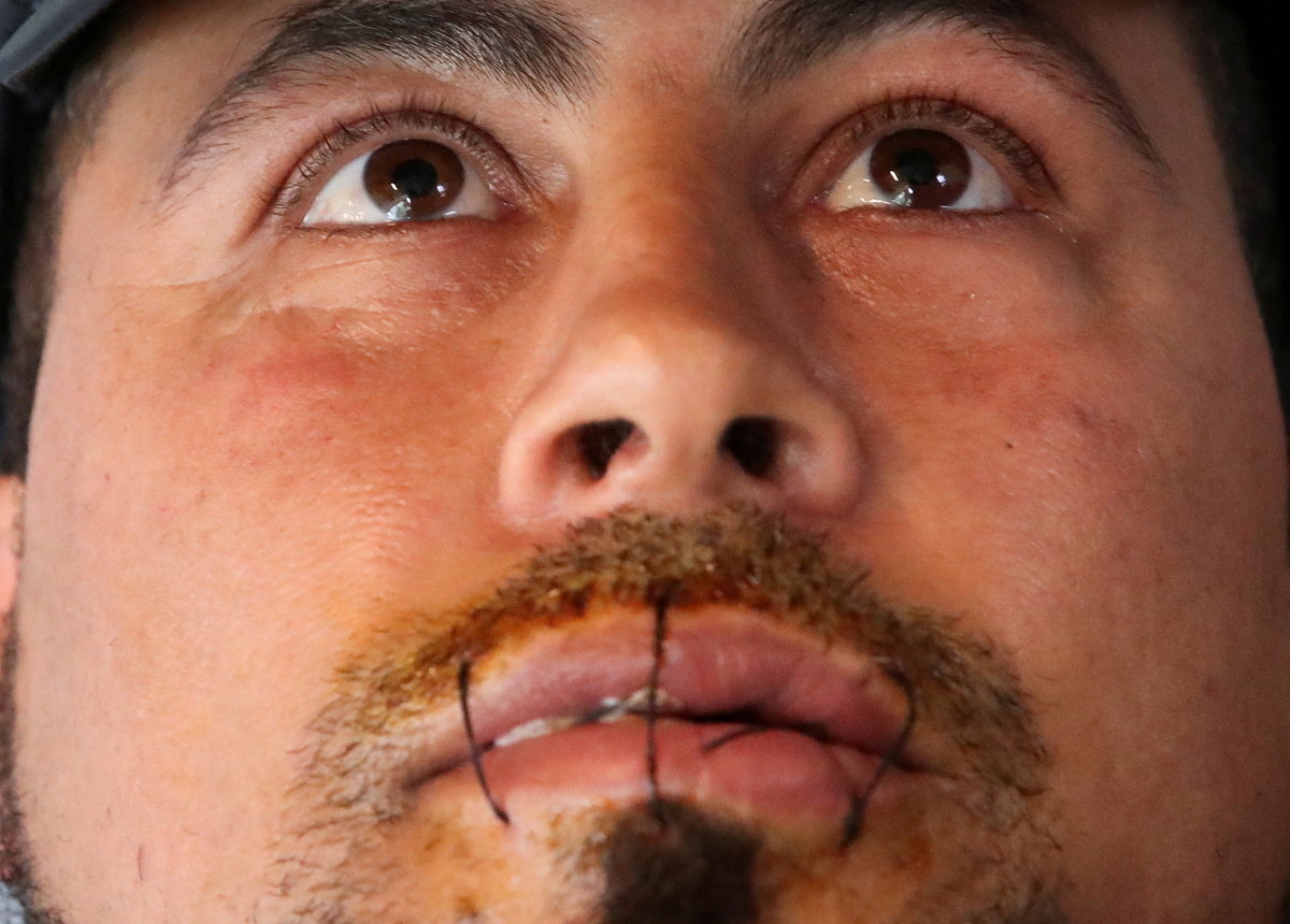 Mohamed Lamine, an Algrerian asylum seeker, requesting to be regularised by the Belgian government to have access to healthcare, is seen with his lips sewed together in a room on the campus of Belgium university ULB, where hundreds of migrants are going on hunger strike for more than a month, in Brussels, Belgium June 29, 2021. REUTERS/Yves Herman