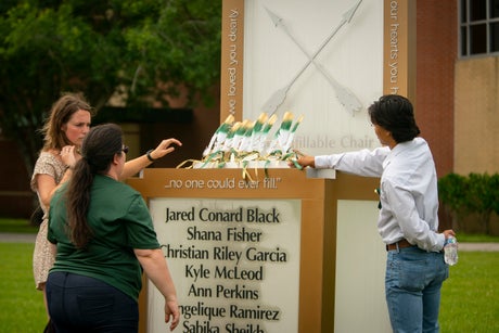 During a ceremony at the high school on Tuesday, Reagan Gaona, one of the chair’s student designers who graduated last year, said while the 10 victims are “no longer... with us, we’ll always have a place for them in our hearts.”