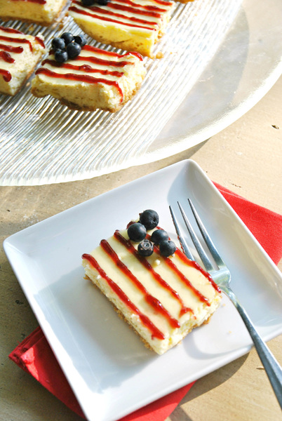 A patriotic day calls for an equally patriotic dessert that brings out the red, white and blue. This easy bar cookie checks all the above boxes, with a creamy white cheesecake base, fresh blueberries for the stars section and raspberry jam piped in thin lines for the stripes.