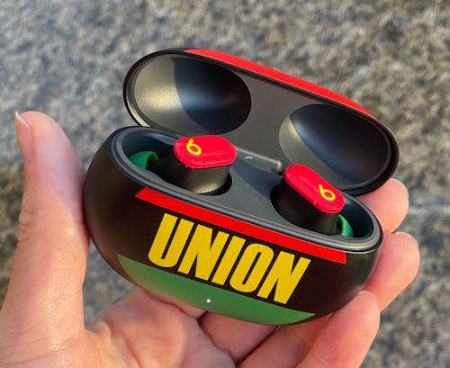 Each color translates to the Studio Buds, too. Red decorates the shiny outer handle as the body of the earbud remains black. Like the case’s Union logo, Beats’ “b” motif comes dressed in yellow, and while the inner part of the earbuds can’t be seen when worn, their green ear tips are festive enough to enjoy when in the case or out of your ear.