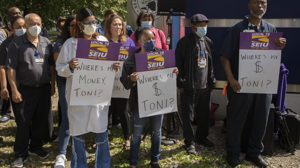 The rally marked the latest clash between the union and Preckwinkle, whom the union backed in her first run for County Board president and in a failed 2019 bid for mayor. Several times in the last year, union members have asked the board to suspend rules to free up the bonus money — one-time payments that will not be affected by the arbitration ruling, which could result in wage increases for some SEIU members.