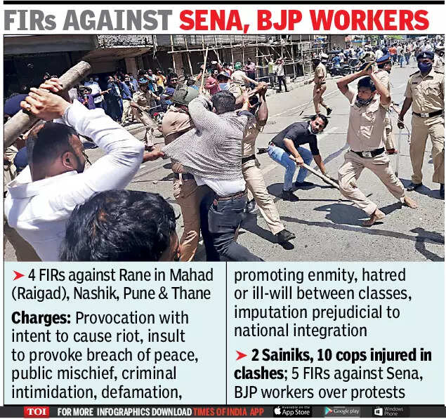 The bad blood between Rane and the Shiv Sena goes back a long way. The Union minister had begun his political career with the Sena and rose to become chief minister in 1999. He had exited the party in 2005, after challenging Uddhav Thackeray's leadership. The Sena had reacted immediately to Rane's statement against Thackeray, with a party worker lodging a complaint against him in Raigad's Mahad taluka on Monday. On Monday night, Rane moved to the adjoining Ratnagiri district. By Tuesday morning, over 500 Yuva Sena workers gathered outside Rane's house in Mumbai's Juhu, ostensibly in response to a tweet from his son Nitesh, "daring" them to do so. The demonstration snowballed into violence as Sainiks clashed with BJP supporters resulting in police lathicharge. The two groups pelted stones at each other. The Sainiks broke police barricades leading to Rane's residence. Ten policemen and two Sena workers were injured.