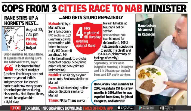The FIRs against Rane were registered in Mahad, Nashik Cyber police station and Pune, and also in Thane on Tuesday. The police have filed four FIRs against the Union minister for his controversial statement under IPC sections concerned with causing disharmony or enmity and breach of peace.