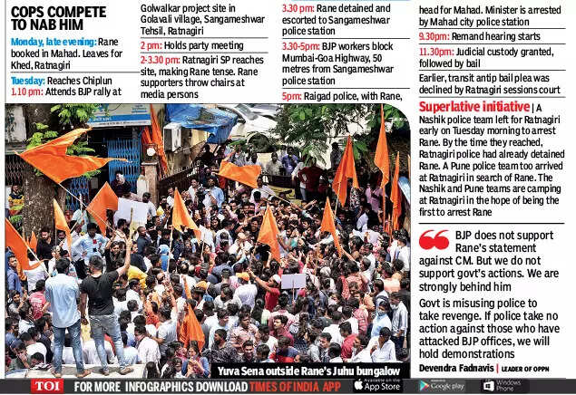 Lawyer Aniket Nikam had tried to file a plea for an urgent hearing in Bombay high court on Tuesday just before Rane's arrest, but could not due to technical reasons. So, there was no hearing on Tuesday. "On Wednesday, we will approach the HC for an urgent hearing with a quashing petition," advocate Shirodkar told TOI. Before the HC, he will be challenging the validity of the arrest and proceedings against him.