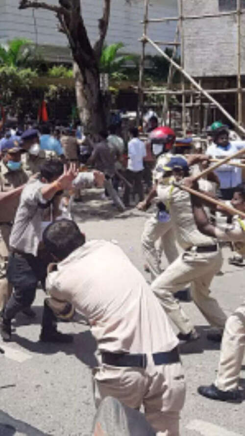 <p>Both BJP and Sena workers pelted stones on each other, following which police used lathi-charge to disperse the agitators. TOI photo: Sanjay Hadkar</p>BCCL8/10:'Slap CM Uddhav' remark: Narayan Rane faces arrest; Sena, BJP workers clash in Mumbai