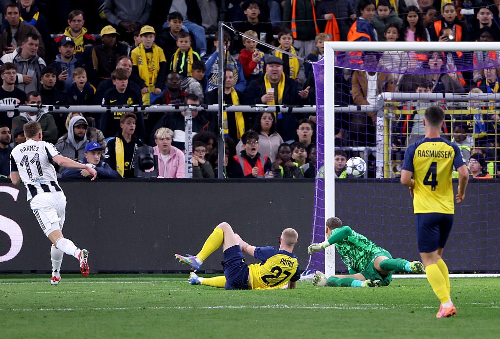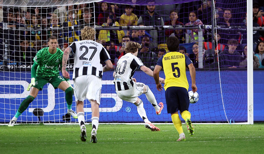 Elanga’s early cross is headed away at the near post and it runs straight to Tonali. He hits it first-time and it looks like it takes an unfortunate deflection off Mac Allister, but replays show Nick Woltemade has produced a brilliant flick with his back to goal to divert it into the bottom corner for 1-0!